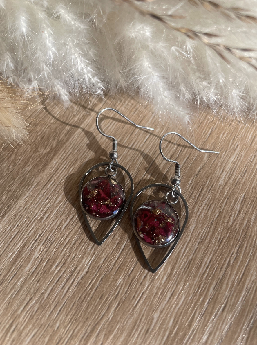 Découvre cette petite paire de boucles d’oreilles en acier inoxydable, réalisée en résine avec des fleurs séchées et feuilles d’or 🌸