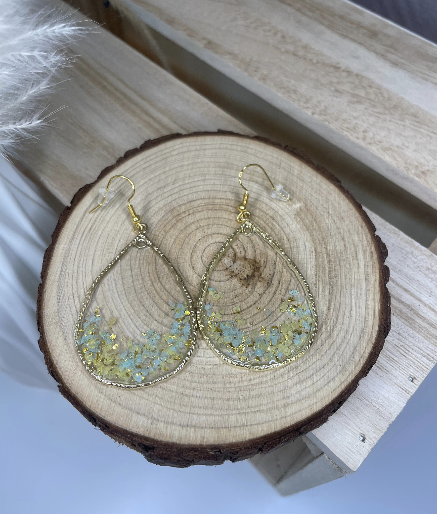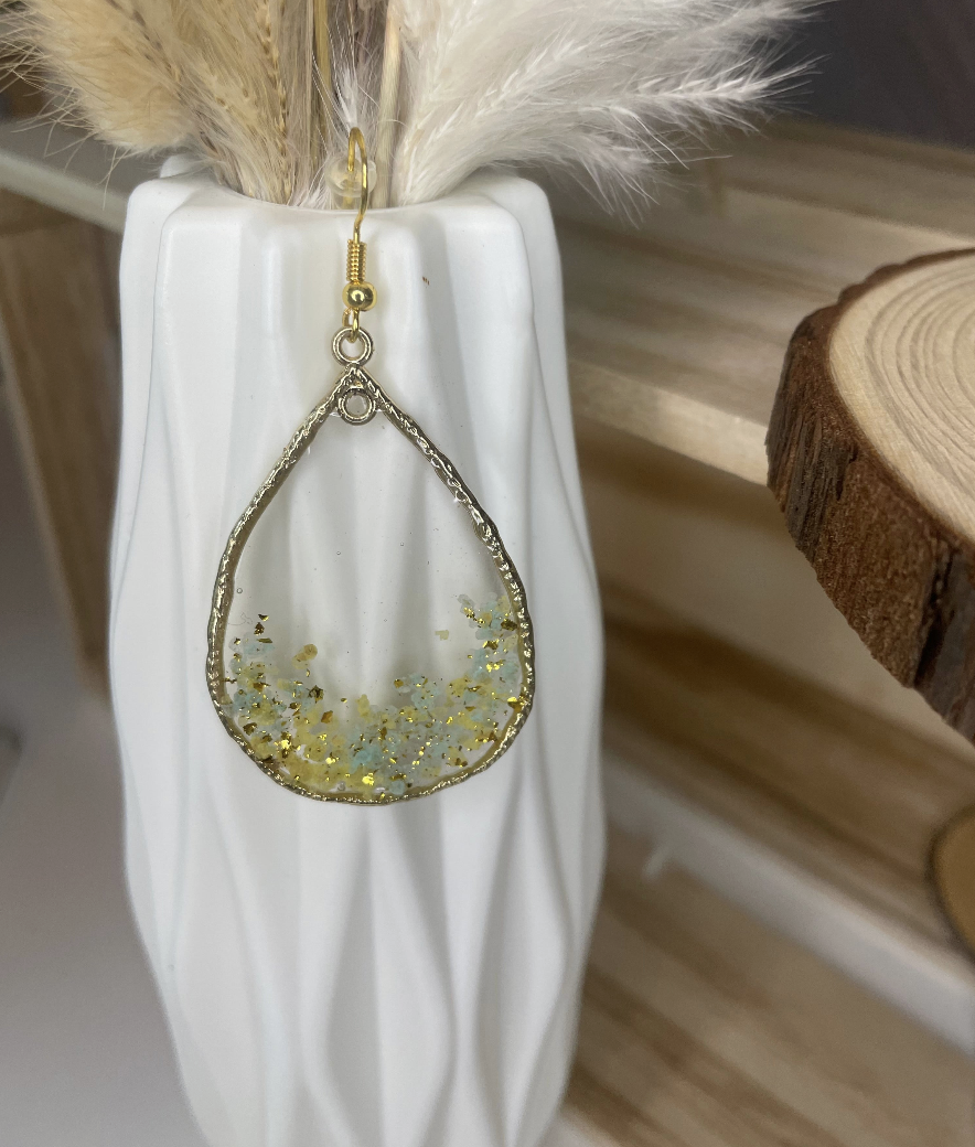 Entourées d’une belle et délicate monture en métal doré, ces boucles d’oreilles vous donneront l’impression de porter un morceau de nature. Chaque pièce est unique en son genre. Chacune est unique et belle, il n’y en a pas deux qui se ressemblent !