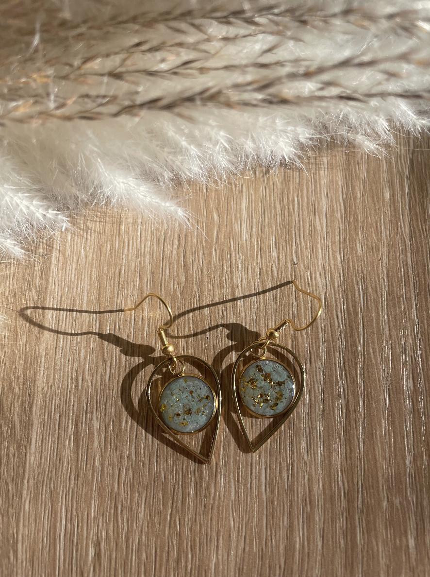 Découvre cette petite paire de boucles d’oreilles en acier inoxydable, réalisée en résine avec des fleurs séchées et feuilles d’or 🌸