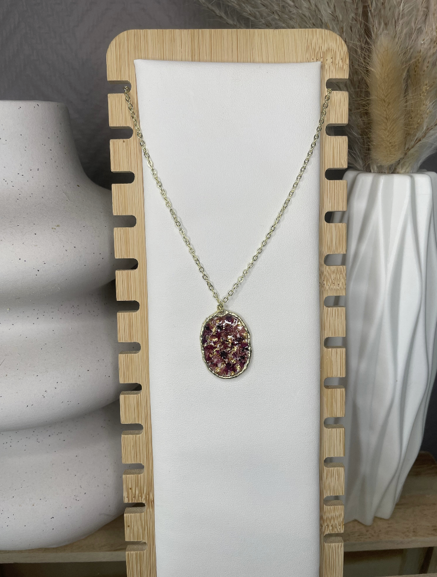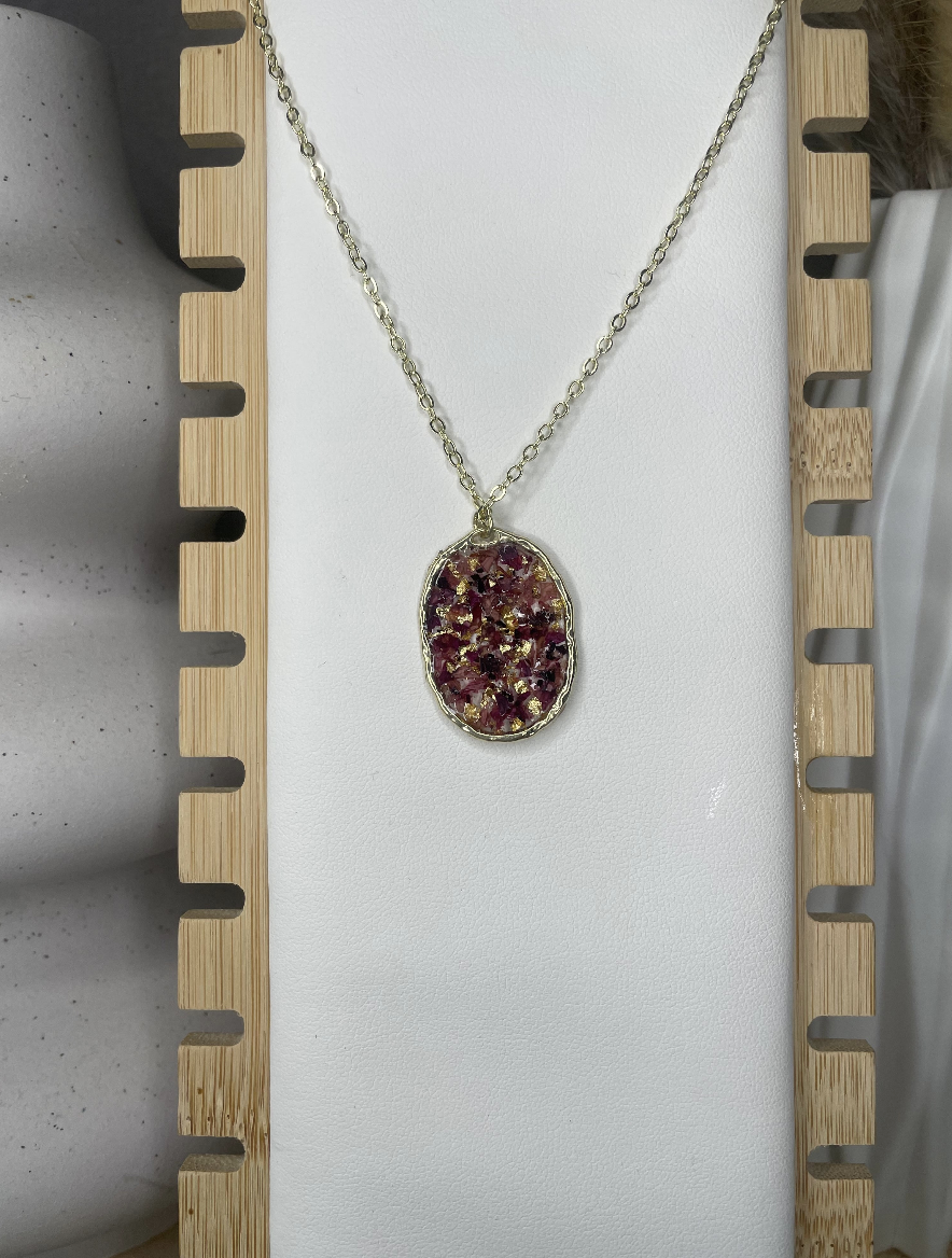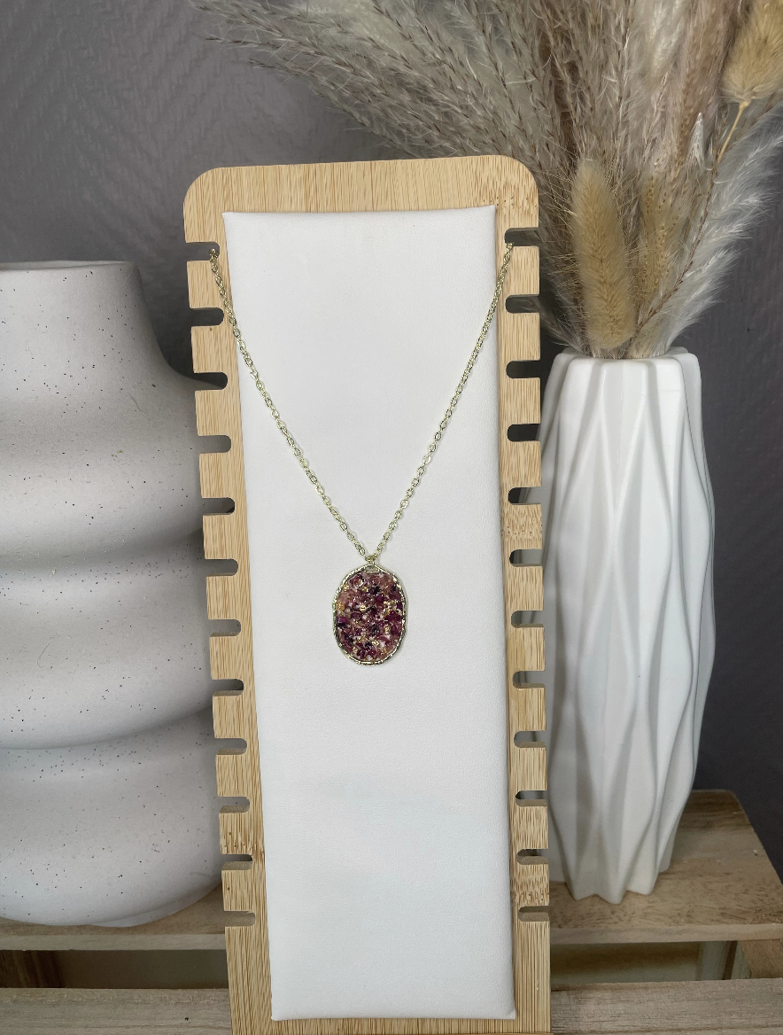 Ce joli collier est réalisé avec de vraies fleurs séchées, le support en acier inoxydable pour la chaîne, le médaillon est en laiton, et le tout est composé avec de la résine époxy ✨