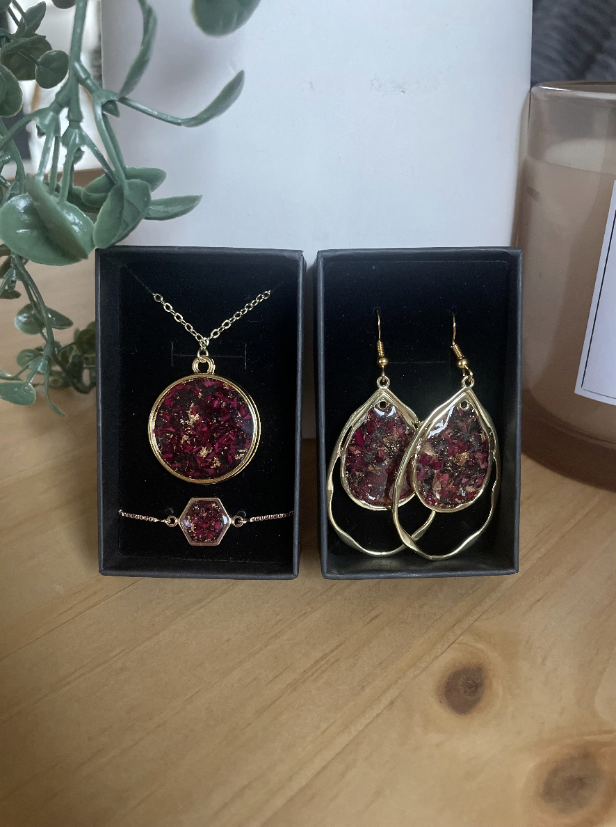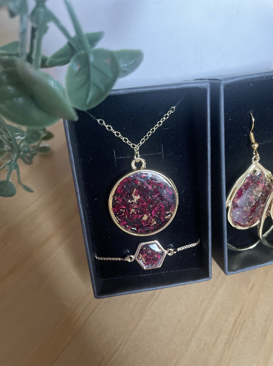 Découvre cette ensemble de bijoux en acier inoxydable, fait main avec des pétales de roses et feuilles d’or dans la résine 🥀