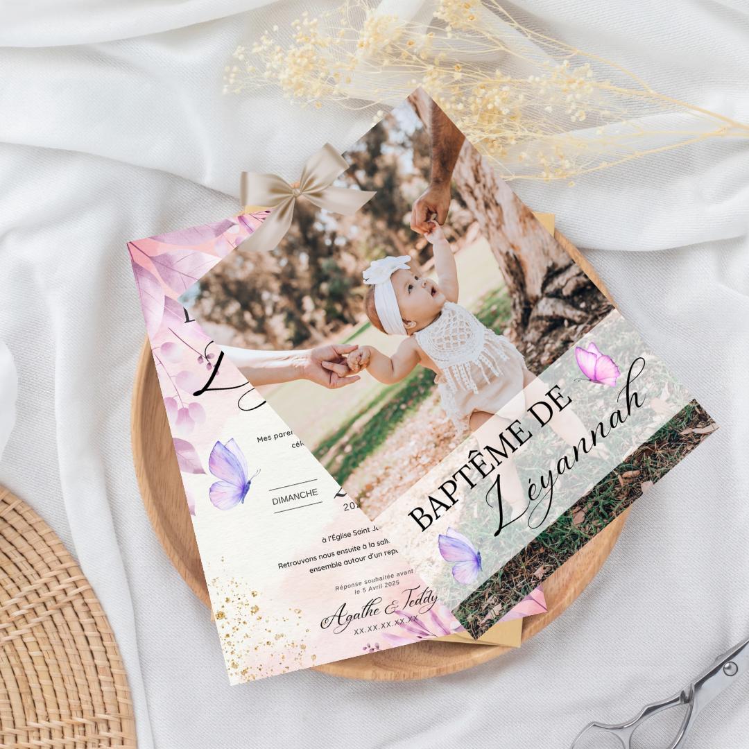 Personnalisez le faire-part baptême “Petits papillons violet” pour inviter tous vos proches à la cérémonie de baptême de votre enfant.