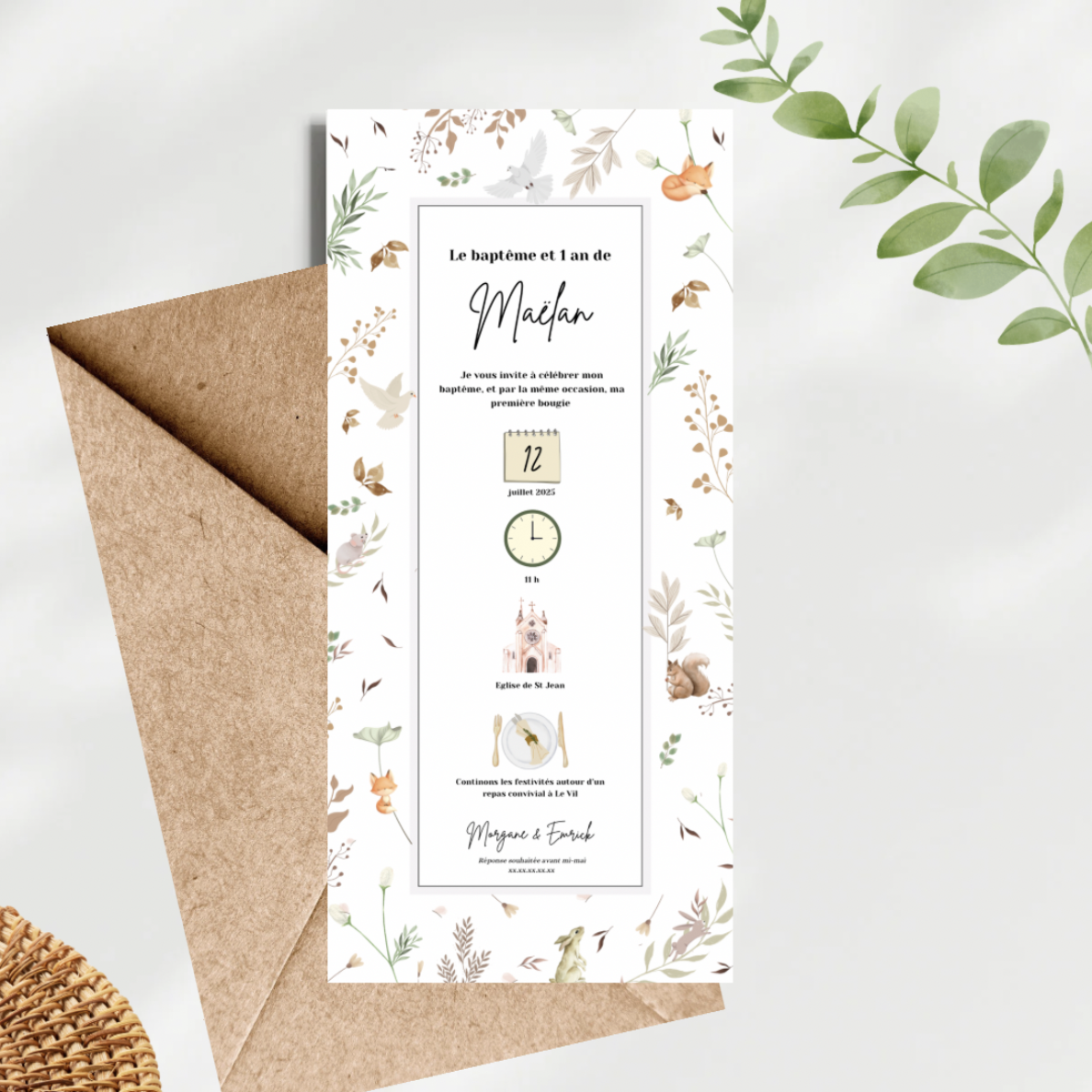 Invitez vos proches au baptême et/ou anniversaire de votre enfant avec le faire-part nature.