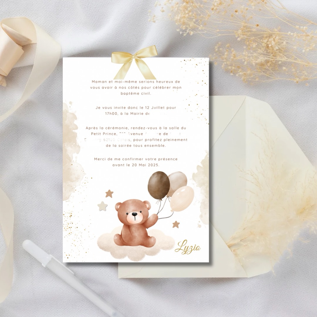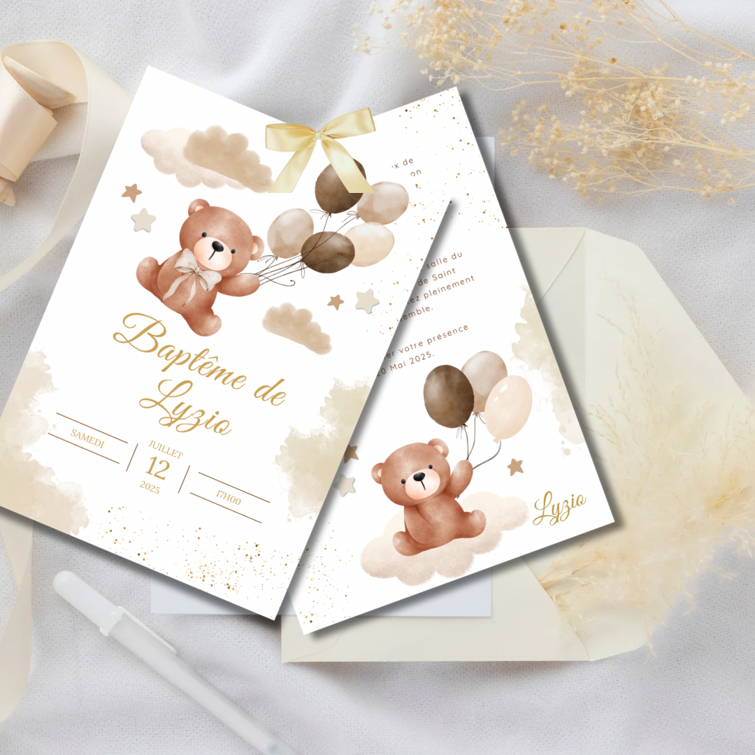 Invitez vos proches et amis à célébrer le baptême de votre enfant grâce au faire-part Ourson beige ✨